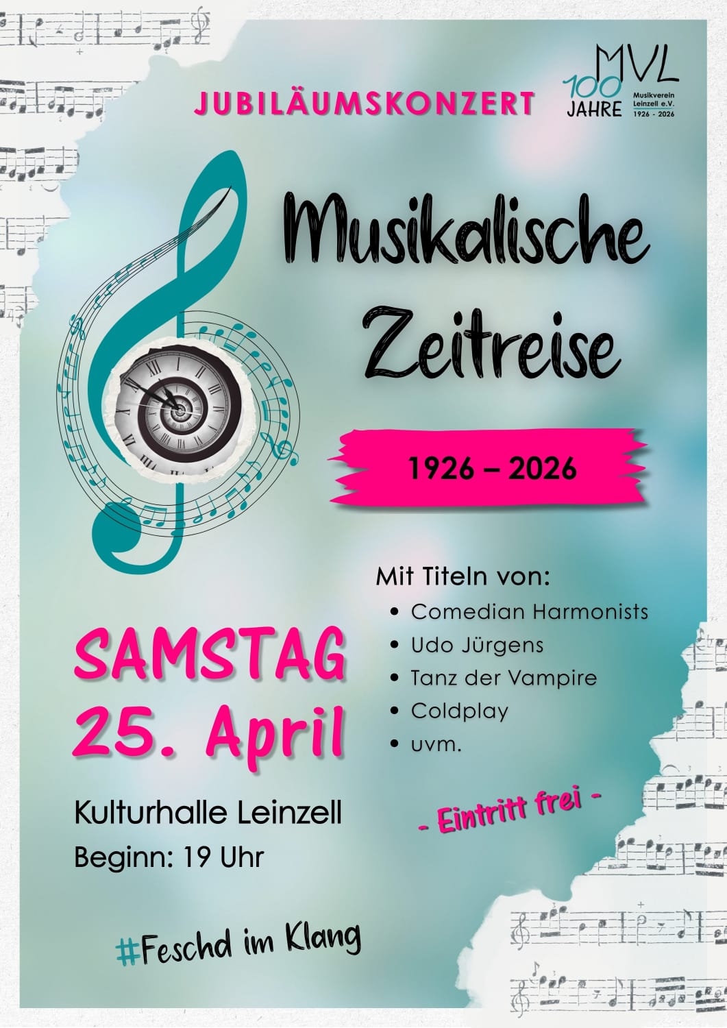 wir, der Musikverein Leinzell, feiern in diesem Jahr unser 100-jähriges Jubiläum. Mit dem aufTAKT am 04. Januar 2026 starteten wir mit vollem Erfolg in unser Jubiläumsjahr.